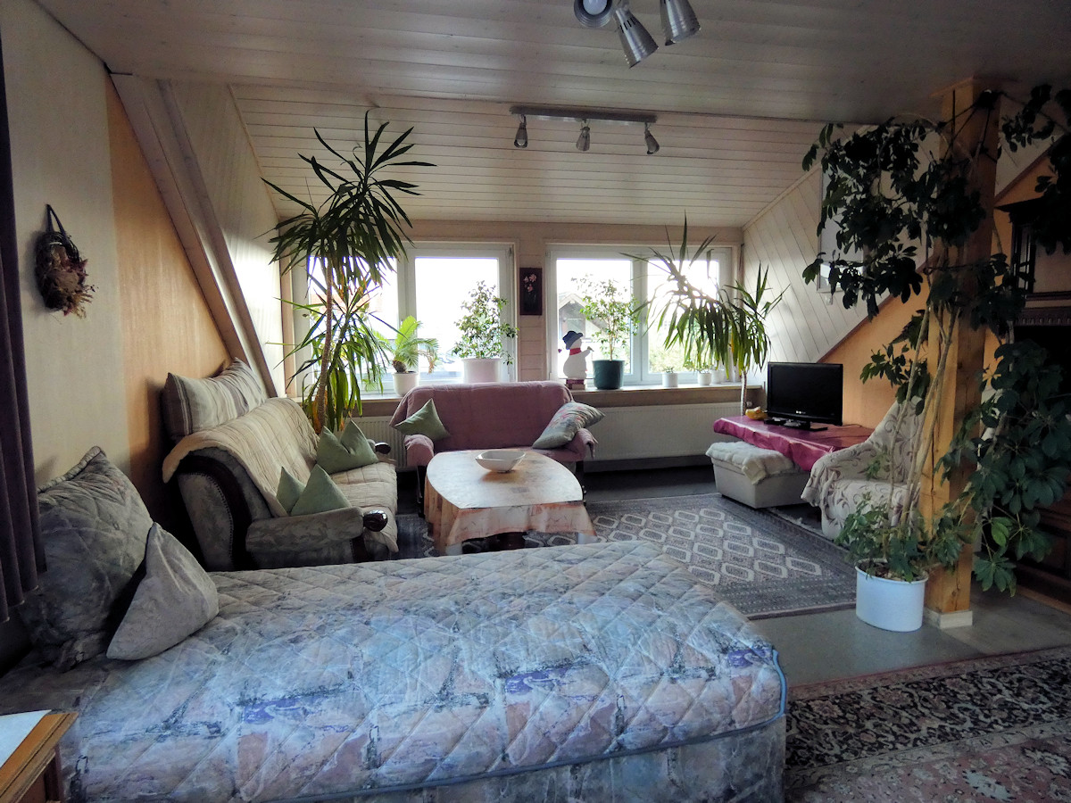 Fernseher vorhanden. Komplett eingerichtete Küche mit Essecke. Schlafzimmer mit Doppelbett und großem Kleiderschrank sowie Sitzgruppe.